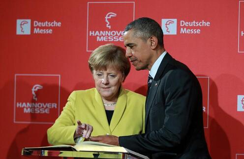 4月24日,在德国汉诺威,德国总理默克尔(左)和美国总统奥巴马出席汉诺威工业博览会开幕式。当晚,2016年汉诺威工业博览会开幕式在德国汉诺威举行,德国总理默克尔和美国总统奥巴马出席开幕式并发表讲话。