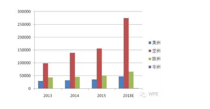 从市场结构来看,亚洲地区的销售规模占据主导地区,2015年销售量为15.6万台,是欧洲、美洲和非洲销售量之和的1.8倍,预计到2018年,此比例将达到2.4倍。