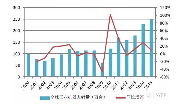 根据国际机器人联合会IFR的统计,过去十多年,全球工业机器人景气度较高,2015年,全球工业机器人总销售量达到248000台,同比增长15%,2002-2008年,全球工业机器人年复合增长率为8.6%,2009-2015年全球工业机器人年复合增长率为23.5%,是过去6年的2.7倍,近几年全球工业机器人增速明显加快。中国、韩国、日本、美国和德国的总销量占全球销量的3/4。中国、美国、韩国、日本、德国、以色列等国是近年工业机器人技术、标准及市场发展较活跃的地区。