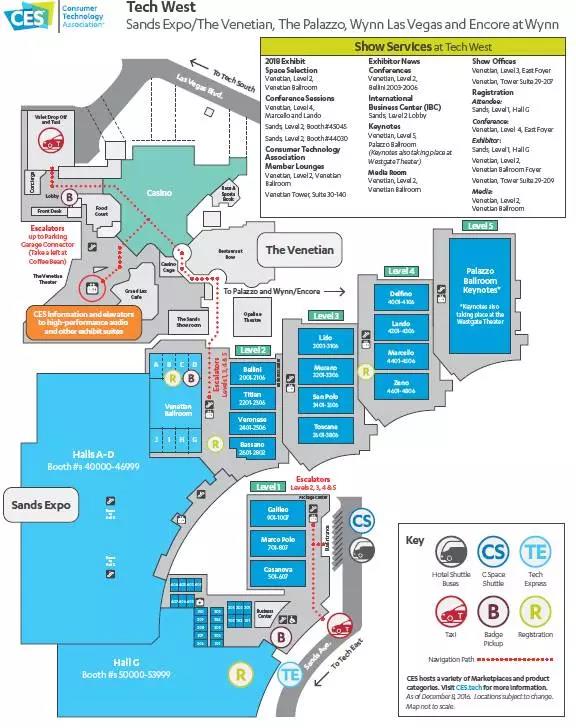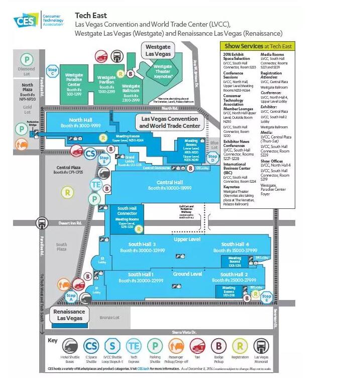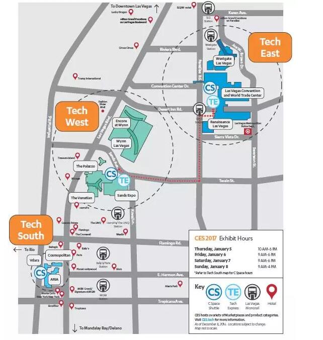 第一次去的小伙伴可能会懵圈,其实CES展区的分布非常规则,展会分为技术东区、技术西区和技术南区,技术东区也即LVCC(拉斯维加斯国际会议中心),包含了北馆、中心馆和南馆,以及西门馆(Westgate),技术西区主要是指金沙馆(Sands),技术南区主要是一些会议区。几大展馆的具体地址如下: