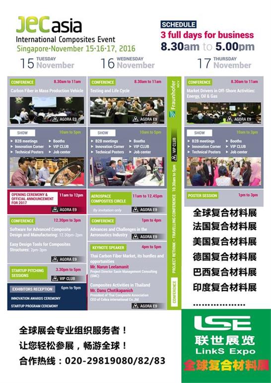 2016亚洲JEC复合材料展(JEC Asia 2016) 于2016年11月15-17日在新加坡SUNTEC 中心举行第9届展会。亚洲复合材料展会暨讲座被视为亚太地区唯一一项可以召集全球复合材料行业价值链上所有重要参与者的盛会。 每年有来自澳大利亚、中国、印度、日本、马来西亚、新加坡、台湾和泰国等国家和地区的具有影响力的复合材料行业专业协会参与其中。 联世展览致力为您提供适合的工具和对口的服务,优化您的投资回报,提高您的知名度,让贵公司的产品成为关注焦点,助您在在亚太地区更加迅速地发展您的复合材料业务。